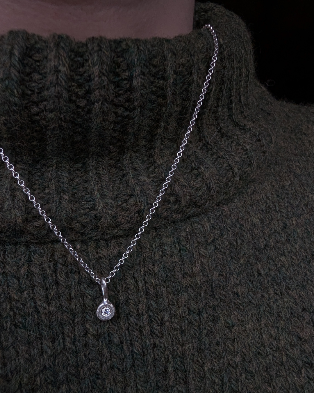 A refined sterling silver pendant featuring a small pebble-shaped disc set with a sparkling 2 mm clear diamond at its centre. The softly textured silver contrasts beautifully with the brilliance of the diamond, creating a subtle yet eye-catching detail.