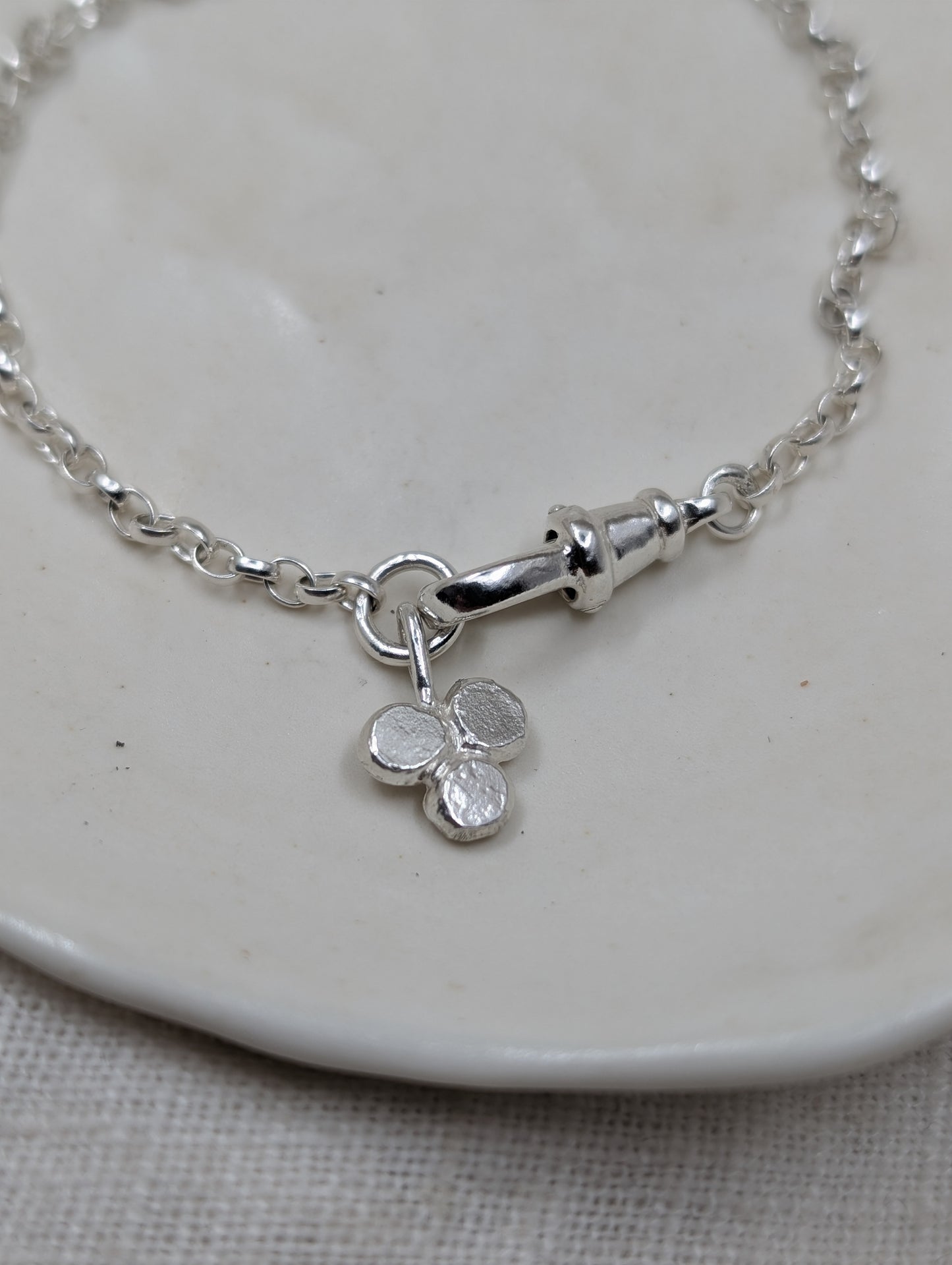 Our Trio Pebble Bracelet is the perfect addition to your MM bracelet stack. Crafted with care, this bracelet features three textured pebbles hung on a 2.5mm belcher chain, the bracelet is finished with a decorative Albert clasp for a touch of classic sophistication and secure wear.